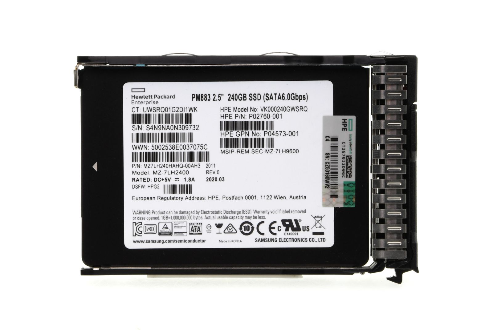 - HPE 240GB 6G SATA Read Intensive SSD 2.5" SFF Solid State Disk (PM883) mit Smart Carrier - P05319-001 / P04573-001